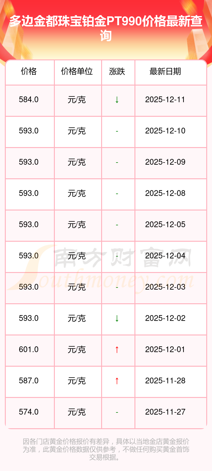 584.0元/克的价格,是多边金都珠宝今日 铂金PT990的最新行情。